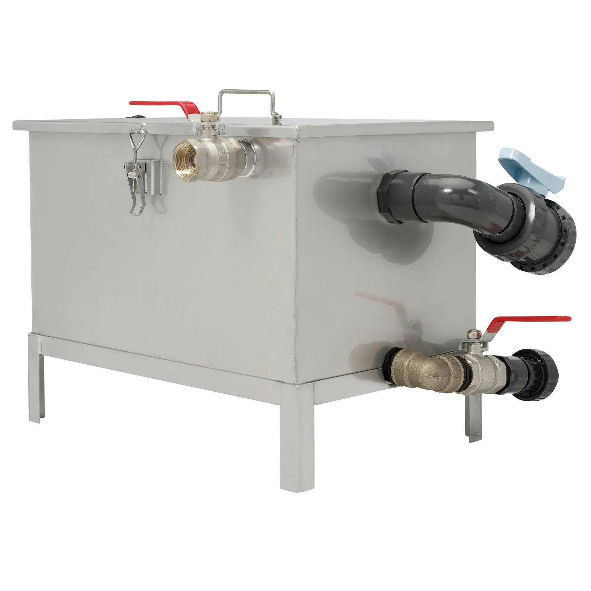 Der Deckel wird mittels robuster Spannverschlüsse sicher verschlossen und gewährleistet jederzeit eine optimale Abdichtung. Die mitgelieferten Standfüße erleichtern die Reinigung unter dem Gerät erheblich. Zur Verkürzung der Installationszeit wird das komplette Zubehör für den Anschluss an das Abwassersystem direkt mitgeliefert.