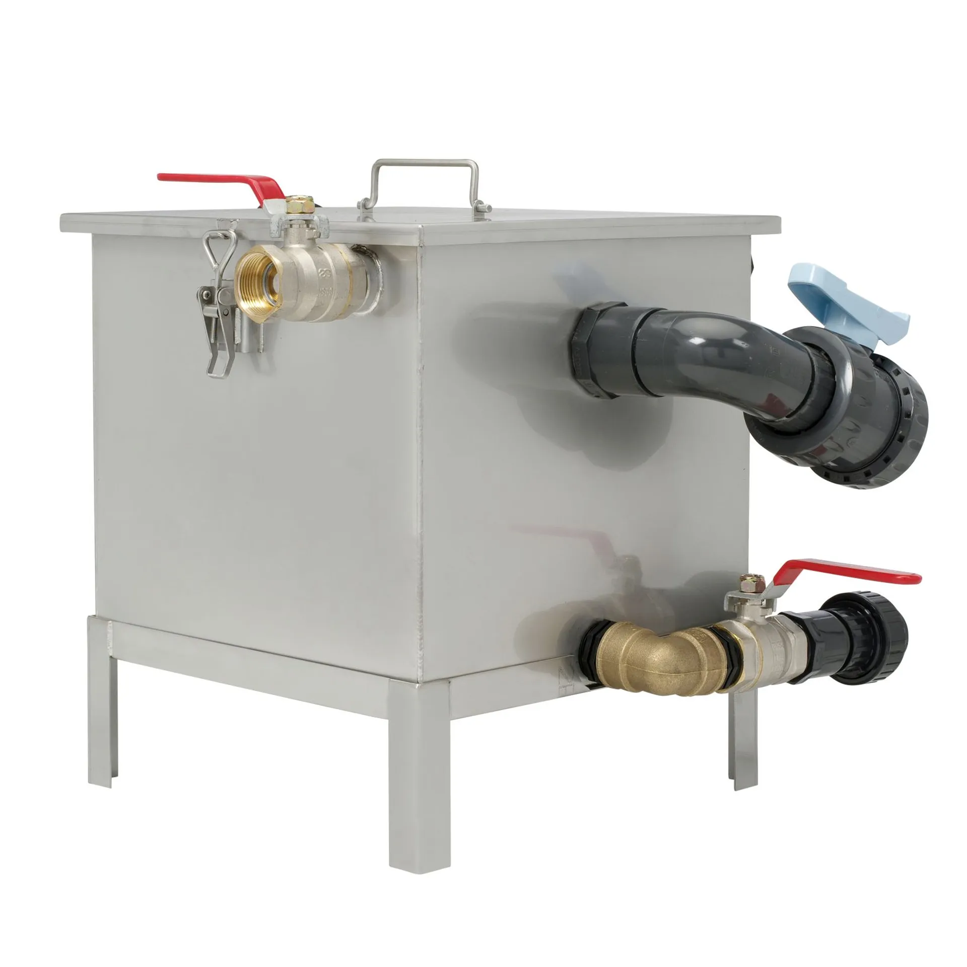 Der Ölabscheider besteht aus lebensmittelechtem, rostfreiem Edelstahl 304L, wiegt 25 kg und steht für Qualität, Langlebigkeit und Nachhaltigkeit. Da sein Betrieb keinen Stromanschluss erfordert, ist er besonders zuverlässig und ausfallsicher.
